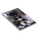 Photo of an adorable Husky puppy dog with striking blue eyes sitting up in a snow lined background.