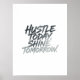 A striking motivational typography design featuring the powerful message: "Hustle Today, Shine Tomorrow." The quote is rendered in a bold, brush-script style with a cool metallic, gradient effect that perfectly illustrates the shift from the hard work (darker "Hustle Today") to the reward (lighter, shining "Shine Tomorrow"). This design is a daily reminder that dedication and hard work now lead to success and brilliance in the future. Perfect for entrepreneurs, students, or anyone focused on achieving their goals.