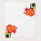 Hybrid striped tea rose orange-red watercolor floral on a white and coral background vertical wedding guest place seating cards. Perfect for a botanical rose flower-themed wedding. Edit these cards with your own handwritten guest names. Other matching items are available. Original watercolor hand painted rose and design by Sarah Trett for www.mylittleedenweddings.com