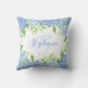 This pretty pillow features a modern floral watercolor design with blue hydrangea flowers and greenery leaves and foliage. Personalise it with a name and initial