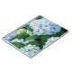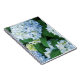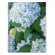 Notebook shown with a photo print of pretty blue hydrangea flowers.