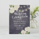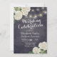 Wedding Celebration Invitation Cards Template - Elegant White Hydrangea Flowers and String Lights on Vintage Navy Blue Floral Linen Background.