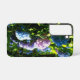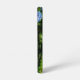 Phone case featuring a garden with blue, purple, and pink hydrangea flowers in bloom in the summer.