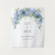 Elegant and stylish blue hydrangea photo prop backdrop to make your memories last. This design features a white background, blue hydrangea floral arch, couple's names, wedding date and 'hastag' text. Customise this special and unique design to make it your own.