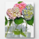 Classic rustic pink, blue, and green Hydrangeas in Mason jars