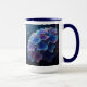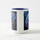 A vibrant purple and blue hydrangea with a bee stands out in stunning detail against a dark background.
