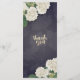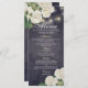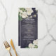 Wedding Menu Rack Cards Templates - Elegant White Hydrangea Flowers and String Lights on Vintage Navy Blue Floral Linen Background.