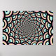 This is a captivating abstract image featuring a repetitive pattern of concentric, layered arch or scale-like shapes arranged to create an optical illusion of depth, pulling the viewer towards a central point. Each curved element is composed of bands of light blue, soft pink, and pale yellow, outlined in black. Small black dots are placed within the innermost coloured band of each shape unit. The pattern repeats outwards on a solid black background, creating a dizzying, tunnel-like effect. The overall style is graphic, geometric, and distinctly psychedelic, designed to be visually striking and somewhat disorienting. (designed by freepik)