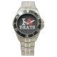 Has heft and feel of expensive stainless steel quartz watches. Good band with safety catch. I removed links, which is easy because engraved arrows show direction to push the linking pins. As always by this seller, the image (a railroad logo) is a perfect reproduction of my emailed image, and is precisely spaced and aligned.