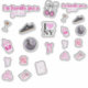 various pink and white icons and text. Starting from the top, there's a statement that reads 'I'm literally just a girl xxx'. Below this, there are several icons: a martini glass, a pair of sneakers, a 'I ❤️ NY' sticker, a coffee cup with a heart, an 8-ball, a pink bow, a pair of dice, a 'NY' logo, a playing card with the Ace of Clubs, and a pink cloud-like shape with the text 'NYC'.