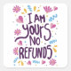 Lovely and cool design with the Quote "I am Yours, No Refunds". Show your love and affection to your boyfriend, girlfriend, husband, wife dad, mum, granddad, grandma in a funny and romantic way.