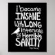 Edgar Allan Poe was a 19th century American author and poet famous for his stories of horror and the macabre. The quote in this Poster, "I Became Insane with Long Intervals of Horrible Sanity”, was said to be written by Poe in a letter describing his state of mind due to the death of his beloved wife.