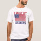 "I Built My Business" t-shirt design featuring the American flag and text in the colours "Old Glory Red" and "Old Glory Blue" - the official colours used in the USA flag. All text elements are customisable on-page.
