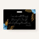 Black and white with modern script. Blue and gold floral faux glitter accents