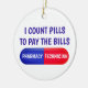 This ornament displays the text "I count pills to pay the bills." This humourous ornament is great for pharmacy technicians.