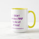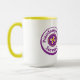 Coffee ringer mug with the slogan "I didn't survivor PMP to die of stress" on one side and the Pseudomyxoma Survivor button logo on the other.