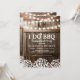Rustic "I DO BBQ" couple engagement party invitations featuring a country barn wood barrel background, twinkle string lights, babys breath flowers, wedding engagement ring, your monogram and a couples shower celebration template that is easy to personalise.