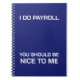 I Do payroll. You Should Be Nice To Me This design helps payroll professionals stay organised and on top of their game by tracking their insights, strategies, and brilliant ideas.