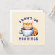 Embrace your morning grumpiness with this adorable greeting card featuring a cute orange cat and the witty phrase, 'I Don’t Do Mornings.' Perfect for cat lovers, coffee enthusiasts, and night owls, this playful design captures the essence of those who need coffee before taking on the day. A great gift for cat enthusiasts and grumpy morning personalities alike!