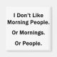 For the sarcasm lover in all of us. Check out this witty “I Don't Like Morning People. Or Mornings. Or People” design on apparel, mugs, mousepads, buttons, and other unique gifts.