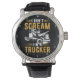 This wall clock features a humourous and assertive statement from a truck driver. Against a black background with a golden-yellow rim, it displays a white semi-truck graphic. The bold text "I DON'T SCREAM I'M A TRUCKER" is prominently displayed in a distressed golden-yellow and white font, making a witty declaration about the no-nonsense attitude often associated with professional drivers.