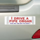 Bumper sticker proclaims in large red letters that "I drive a pipe organ" - with the words "How do YOU get to work" written underneath in blue. Silver organ pipes are at either end of the wording