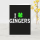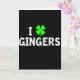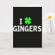 This card features a deep black background with a big, centred message that reads “I ☘️ GINGERS” in uppercase white letters. The “I” sits at the left, the glowing four-leaf clover replaces a heart in the middle, and “GINGERS” stretches across the right in the same strong type. The white lettering has a lightly speckled, worn texture that makes it look softly weathered rather than slick. The clover is a bright electric green 💚 with smooth rounded leaves, standing out as the only colour against the black. With the clover acting like a stand-in for affection, the layout feels like a cheeky little love note or a friendly shout-out. Everything is kept simple and centred, leaving plenty of open black space around the words so your eyes go straight to the message. The green clover sits between the white “I” and the white “GINGERS,” glowing sharply against the dark background.