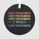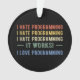 'I Hate Programming. It Works! I Love Programming' funny quote for programmers, tech enthusiasts, coders, and developers.