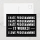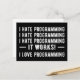 'I Hate Programming. It Works! I Love Programming' funny quote for programmers, tech enthusiasts, coders, and developers.