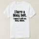 This "I Have a Black Belt" t-shirt is for people who don't take life too seriously, and for people who do. Yes, it reaches a HUGE demographic! The design features rugged, black writing that says, "I have a black belt." In smaller print, it says, "I wear it with my black shoes." If you wouldn't be caught dead wearing a black belt with brown shoes, or if you are a martial arts expert with a flair for fashion, you'll want to order this t-shirt.