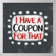 "I Have A Coupon For That" is a cute text design in grey with black and red text, along with a white accent shape and white textured whimsical dots surrounding it.