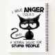 A humorous and sarcastic black-and-white graphic design showcases a black cat with a long tail and a grumpy expression. The bold black text reads, "I have anger issues and a serious dislike of stupid people." This design is available on various products, making perfect gifts for cat lovers.