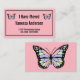 Side one: Two beautiful butterflies accompany the message 'I Have Moved' (which can be changed to 'We Have Moved' or another custom message). At the bottom, you can personalise your moving announcement with your name and new address. The card is pink with black text. Side two: A large butterfly is on the other side.