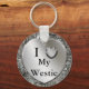 Here's a unique key chain to show your love for your dog. Easily change the breed "Westie" to your pet's breed such as "Poodle", etc. A lovely, fun key chain with a big metal smooth silver colour 3d look heart on a background of shiny, shimmering silver sequins. "I Heart My Westie" is shown with a silver heart in place of the word heart. Easily personalise with your dog or cat's breed or any name to show your love! Great for the animal lover! Realistically printed, not actual sequins, etc.