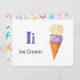 "Letter I is for Ice Cream" in our Alphabet Flash Card set. Get all 26 letters of the alphabet! A double-sided postcard that is great for memory games and teaching, geared for education, schools, teachers and homeschoolers for kindergarten and babies. All text is editable if you need to customise.