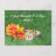 A Dazzling Monarch butterfly on a bright Orange Zinnia. A postcard inscribed with" I Just Thought I`d Say... Hello!!"