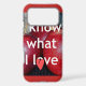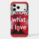 The text "I know what I love" is overlaid in bold, modern white typography, ensuring clarity and impact. A red location pin icon cleverly replaces the "o" in "love," adding a whimsical touch that symbolises connection and passion. The background is slightly blurred, showcasing fabric and a dark surface that enhances the prominence of the apples and text.