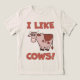 This charming tee shirt design features a whimsical cartoon cow, rendered in a playful and endearing style. The cow is depicted in soft, earthy tones, primarily a muted light brown with a darker reddish-brown patch on its side, all outlined in bold black for a classic cartoon esthetic. This design proudly declares its affection for these gentle creatures with the text "I LIKE COWS!" prominently displayed.