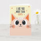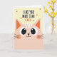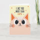 This cute greeting card features a stylized peachy-pink cat whose face fills the lower part of the design. The cat has big black eyes with tiny white highlights, a small smile, and rosy cheek spots that make it look sweet and sincere. Subtle white stripes sit on its forehead, and simple whiskers finish the look. The background is pale yellow with small orange dots scattered around, tying in with the cat’s orange inner ears. Across the upper area, the message reads “I LIKE YOU MORE THAN CATS” in hand-drawn block letters. Most of the text is dark, while the word “CATS” stands out in orange and is placed at the end of the line for extra emphasis. It’s a funny, affectionate way to say someone matters a lot—perfect for a note with ❤️