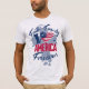 This I Love America, 4th of July men's T-Shirt also features the message of "Faith, Family, Freedom" along with the phrase "I Love America." The design showcases a heart-shaped American flag as its centerpiece, with a subtle crucifix in the background.