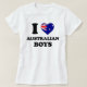 This playful t-shirt proudly declares a fondness for Australian boys, combining the iconic "I Heart" phrase with the national flag of Australia forming part of the love heart. The bold, straightforward message is complemented by the flag's vivid colors, making it a perfect piece for those who appreciate Australia's charm or want to celebrate their Australian heritage.