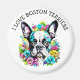 Cute Boston Terrier Dog surrounded by pink, yellow and blue flowers. Ai art. Cute gift for Boston Terrier owners. Boston on board.