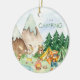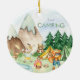 Add a cute custom touch to your little boy or girl's holiday tree decor with this adorable woodland animal camping Christmas ornament. Ornament has a fox taking a picture, a bear carrying a sleeping bag, and a rabbit looking at a butterfly. The animals are in the mountains at a campsite with tents, trees, and a pond. Text says "I love Camping," and the "I love" and first name / year fields may be edited or removed per your preference.