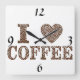 Show the world how you feel about your coffee with this awesome clock. "I LOVE COFFEE" is spelled out in coffee beans. The numbers marking the quarters of each hour are written in black, to match the arms of the clock. However, the numbers and background are customisable.