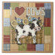 A cute design of a cow with sunflowers on a background of country patchwork and burlap, with the text art I Heart Cows. Makes a perfect gift idea for someone who loves cows, lives on a farm or smallholding or who just likes country style decor and accessories.