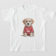This charming illustration features an adorable puppy (looks like a Terrier mix!) sitting patiently, wearing a red t-shirt that proudly states "I ❤️ DAD" surrounded by sweet paw prints. It’s the perfect way for your furry best friend to show his love!