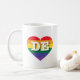 This mug features a rainbow pride heart overlaid by the bold, white, capital letters DE, the official abbreviation for Delaware, the first state. Show your true colours, support marriage equality, and celebrate gay pride.