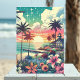 Beach themed anniversary card. Pretty turquoise, teal and pink ocean view with a sunset and silhouettes of palm trees, beautiful tropical flowers and a pier and beach house.