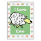 Love you card. Funny sheep cartoon card says "I Love Ewe" - a pun. Personalize with inside message. Say I love you to someone. I love you card with an illustration of a sheep.