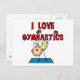A stick figure girl does a handstand on the mat practicing her floor routine and text reads "I Love Gymnastics" on girl gymnast T-shirts, mugs, tote bags, mousepads, stickers, cards, and other girl gymnast apparel and gift items.